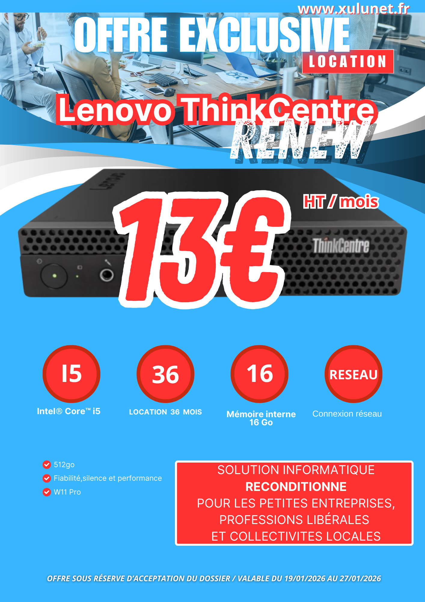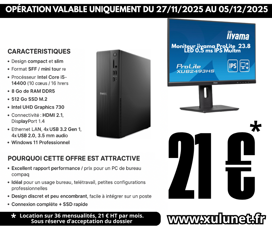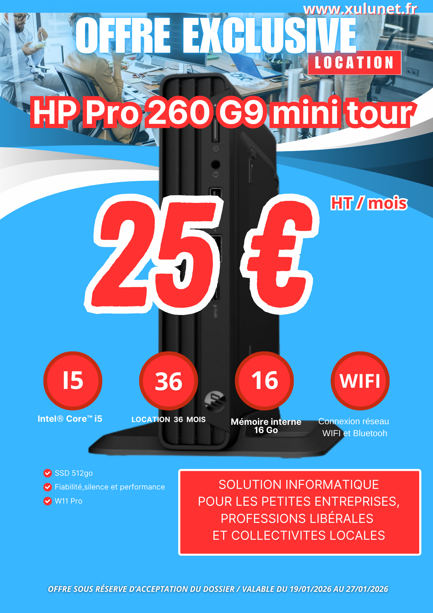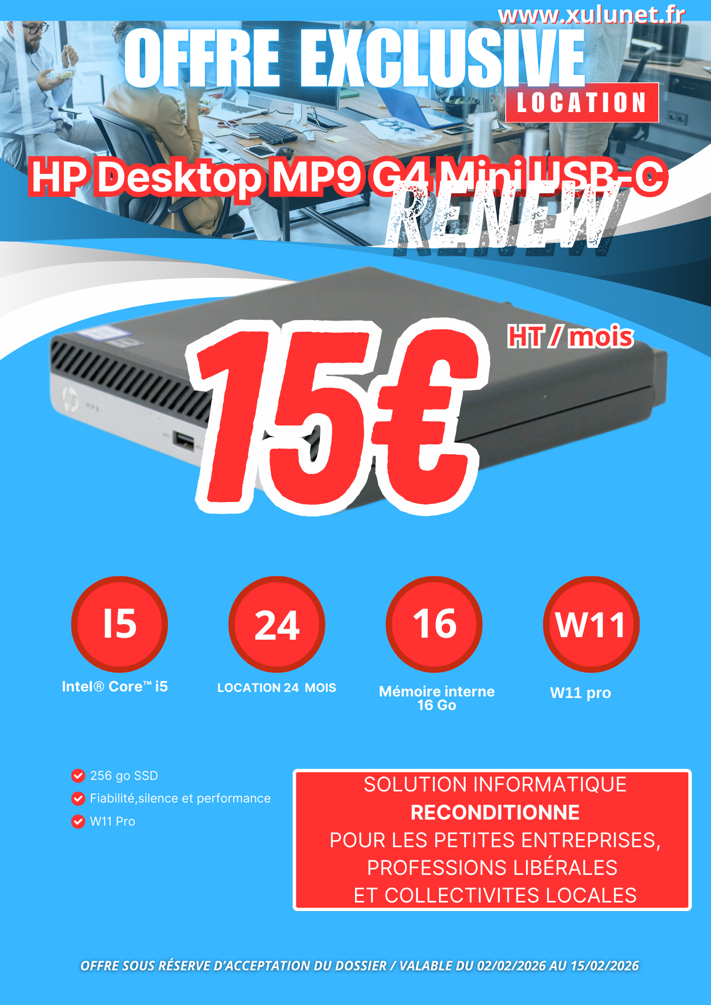Mini PC avec processeur, capacité mémoire et disque et taille de moniteur variable selon les besoins.